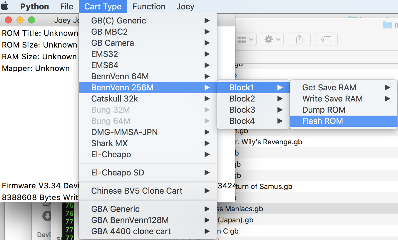 After you’ve added all your roms to the list, press ‘Generate Compilation’ and the program will output multiple files. The Output.GB is only for debugging, you don’t need to flash it to your cart. Find the BennVenn 256M option in the menu and flash Output1.GB to Block1, Output2.GB to Block2 and so on. Follow the instructions, you’ll have to remove and insert the cartridge a few times.