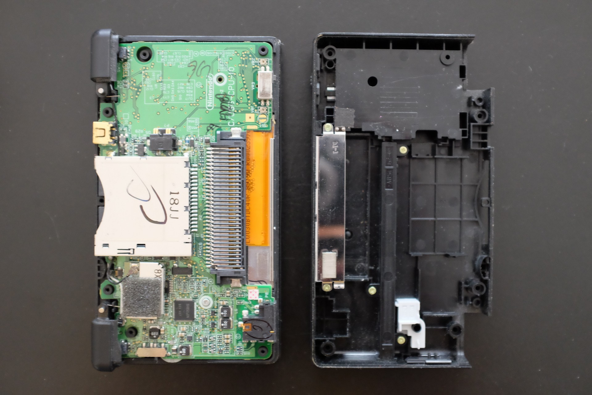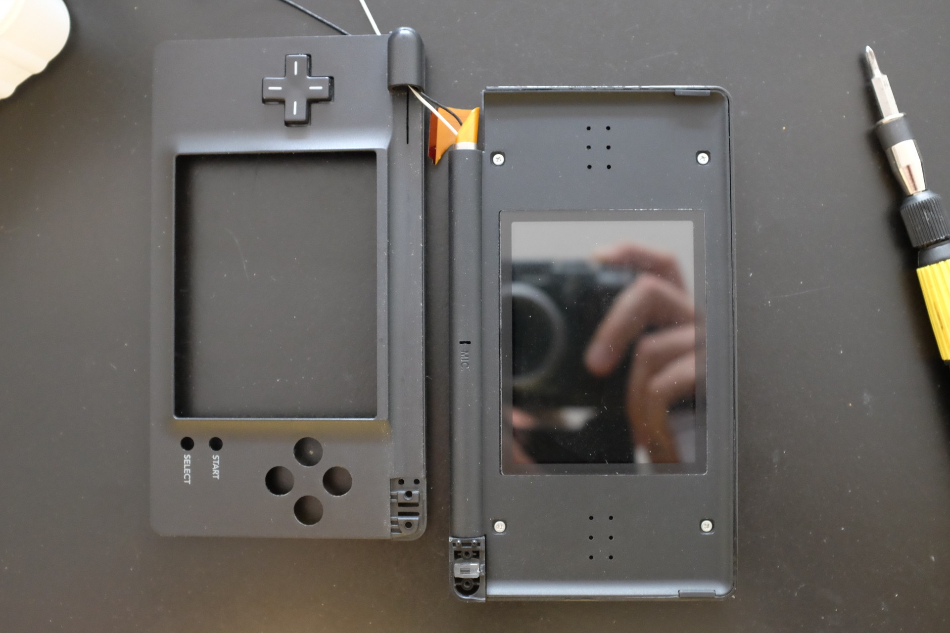 To fix the hinge you need to replace the top frame that holds the screen. Unfortunately you have to take the whole system apart in order to replace this top frame. It seems that you can only buy entire replacement shells (on AliExpress for example, not Nintendo original obviously) and they go for 10 to 14 dollars which isn’t particularly cheap if you just need the top frame. I could use a stylus and a slot-2 cover so in the end the price is ok.