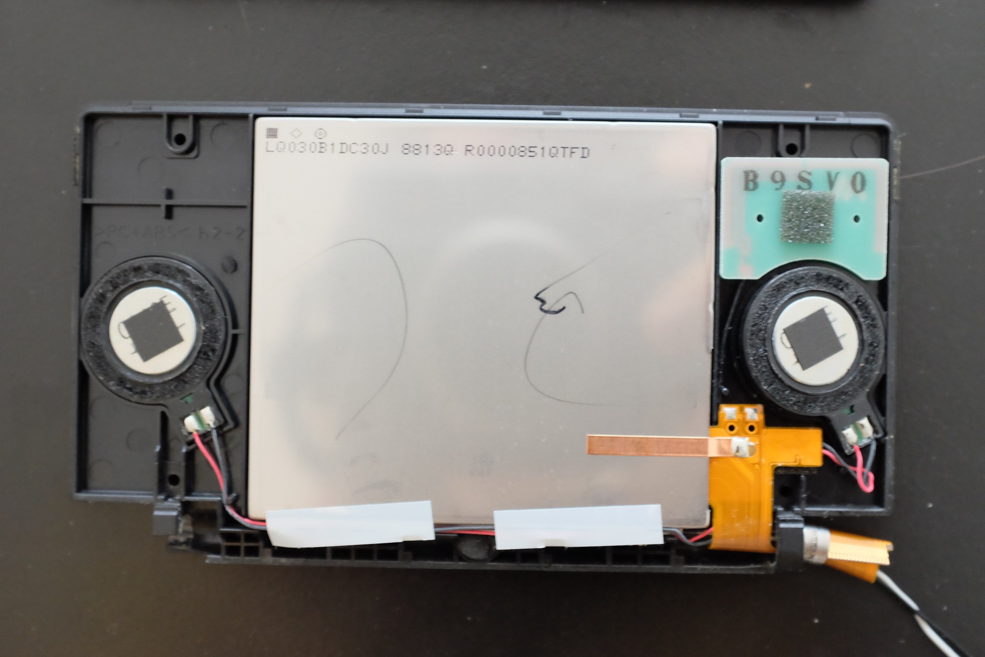 Top half, speakers left and right, top right is the wifi antenna, screen in the middle.
